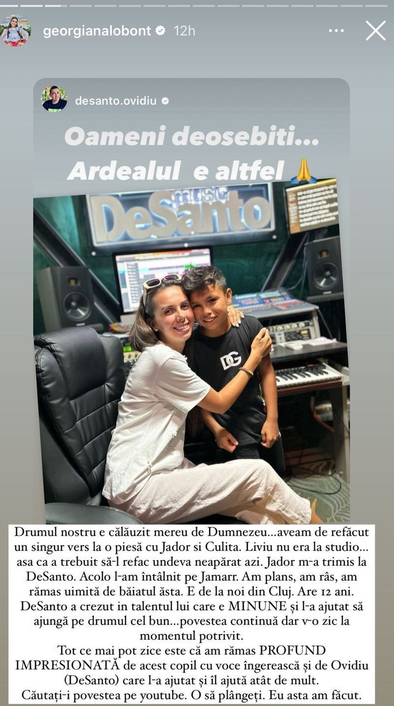 „Drumul nostru e călăuzit mereu de Dumnezeu… aveam de refăcut un singur vers la o piesă cu Jador și Culiță. Liviu nu era la studio… ala că a trebuit să-l refac undeva neapărat azi. Jador m-a trimis la DeSanto. Acolo l-am întâlnit pe Jamarr. Am plâns, am râs, am rămas uimită de băiatul ăsta. E de la noi din Cluj. Are 12 ani. DeSanto a crezut în talentul lui care e MINUNE și l-a ajutat să ajungă pe drumul cel bun… povestea continuă, dar v-o zic la momentul potrivit. Tot ce pot zice este că am rămas profund impresionată de acest copil cu voce îngerească și de Ovidiu (DeSanto) care l-a ajutat și îl ajută atât de mult. Căutați-i povestea pe YouTue. O să plângeți. Eu asta am făcut.”, a scris Georgiana Lobonț în mediul online.