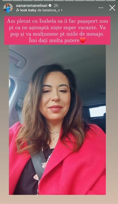 „A plecat cu Isabela să îi fac pașaport nou, pentru că ne așteaptă niște super vacanțe. Vă pup și vă mulțumesc pentru miile de mesaje. Îmi dați multă putere.”, a scris Oana Roman pe Instagram.