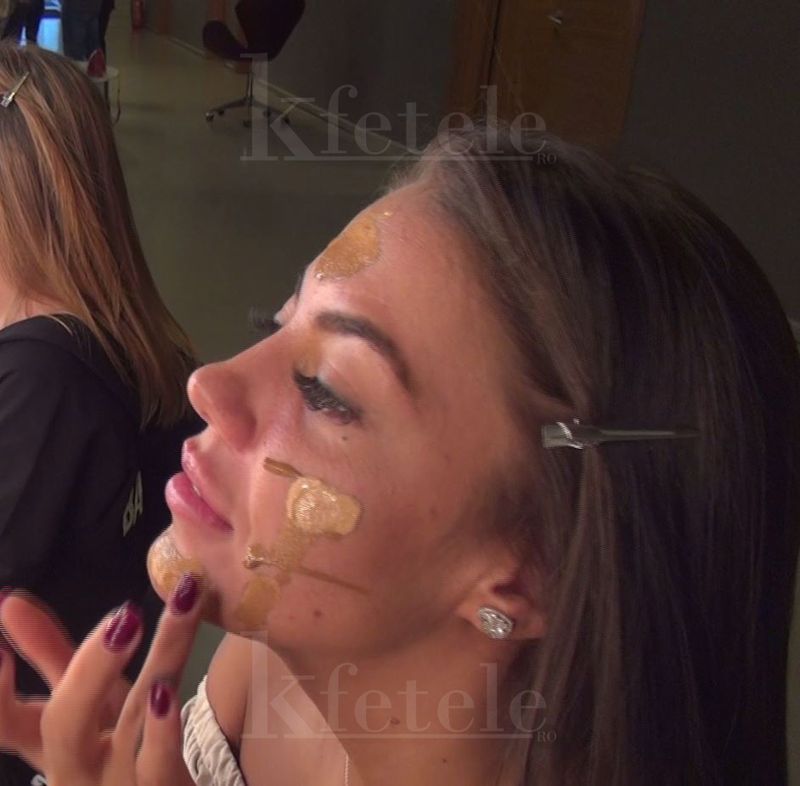 Cu fondul de ten întins pe față, Roxana ne arată cum se aranjează singură…iar forma finală am văzut-o… în emisiune.