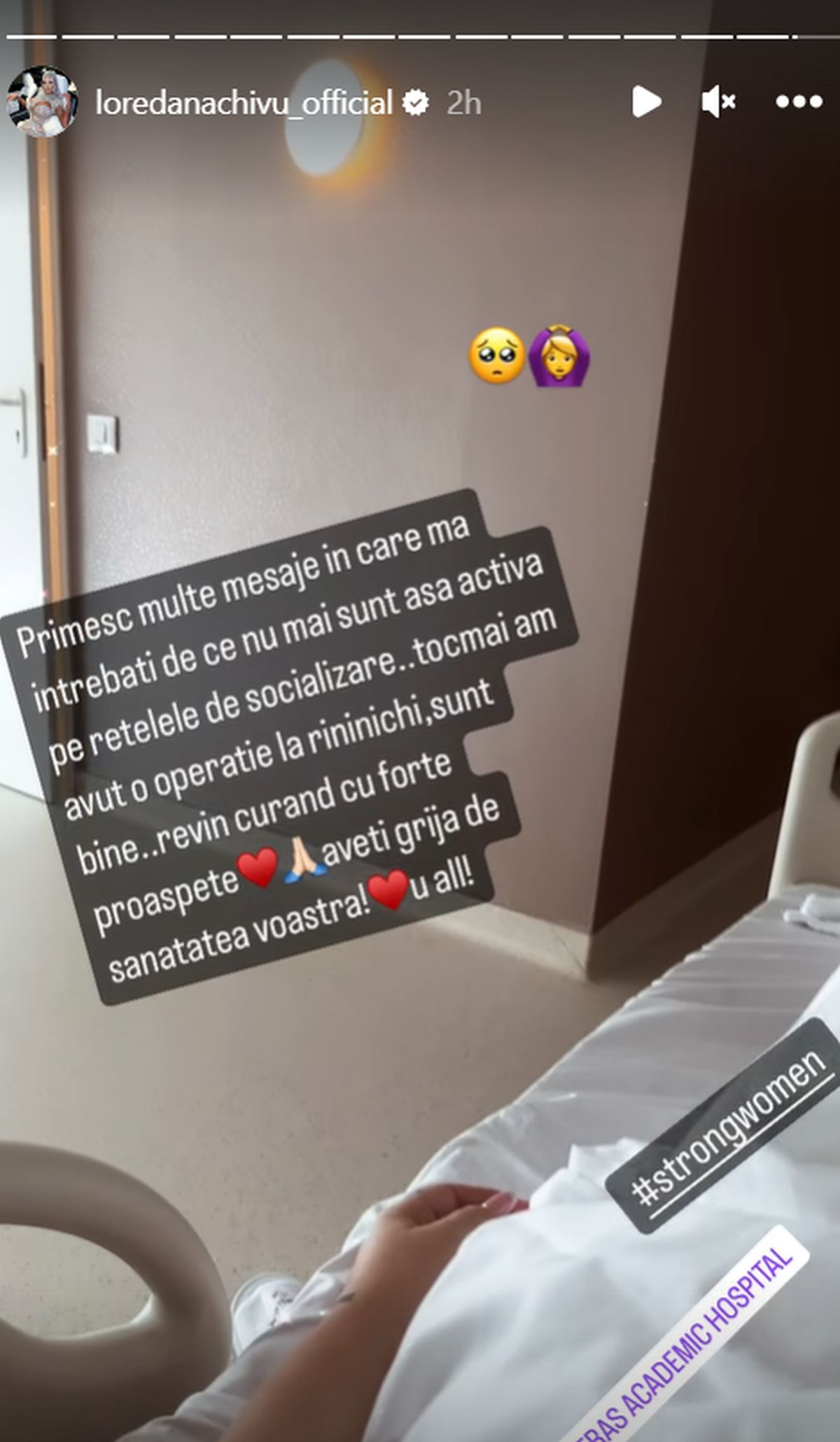 „În momentul de față mă simt bine, am trecut printr-o anestezie generală. Am avut o problemă la rinichiul drept. Am avut o piatră care a plecat de la rinichi în uretră ca să fiu cât de explicită pot. Piatra avea aproape un centimetru și pentru asta a fost nevoie de o operație cu laser și de mai multe tratamente pe care le urmez.