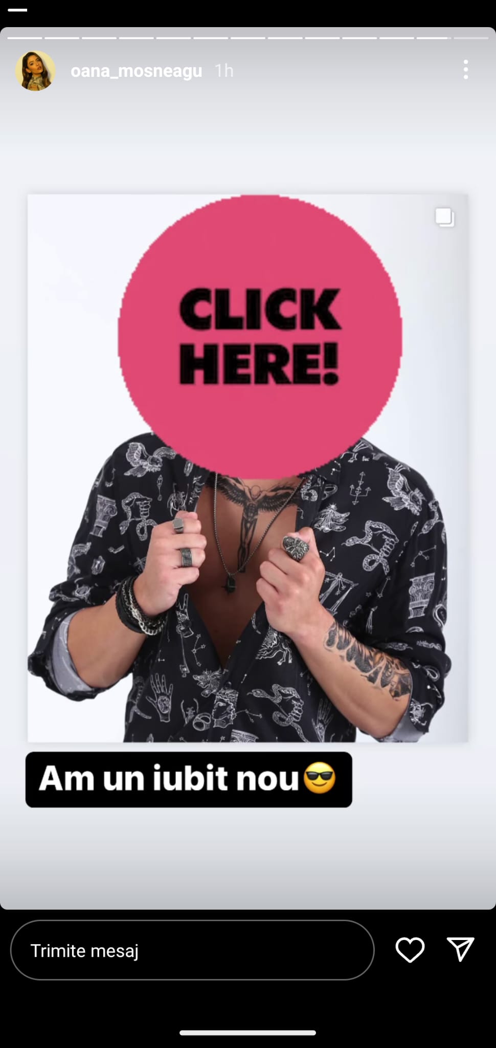 „Am un iubit nou”, a fost descrierea pozei distribuită de Oana Moșneagu pe pagina sa de Instagram, la secțiunea Storie.