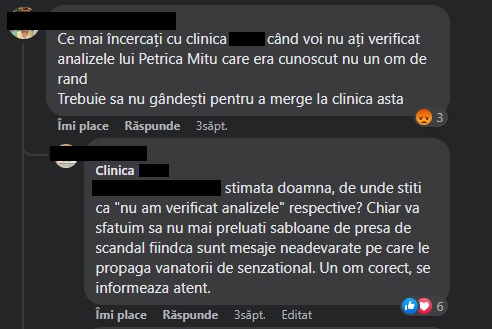 Un urmăritor al activității acestei unități spitalicești a scris un mesaj tranșant: "Ce mai încercați cu clinica, când voi nu ați verificat analizele lui Petrică Mîțu Stoian, care era cunoscut, nu un om de rând!". Comentariul negativ nu a fost lăsat fără răspuns din partea clinicii: "De unde știți că nu am verificat analizele respective? Chiar vă sfătuim să nu mai preluați șaboane de presă de scandal, fiindcă sunt mesaje neadevărate pe care le propagă vânătorii de senzațional. Un om corect de informează corect."