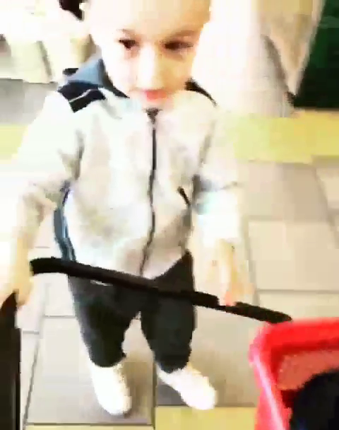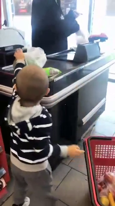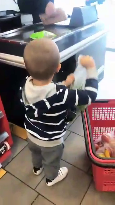 Si la cumparaturi, David stie ce are de facut. Micutul plimba cosul in supermarket, iar la casa de marcat el vrea sa aseze cumparaturile pe banda.