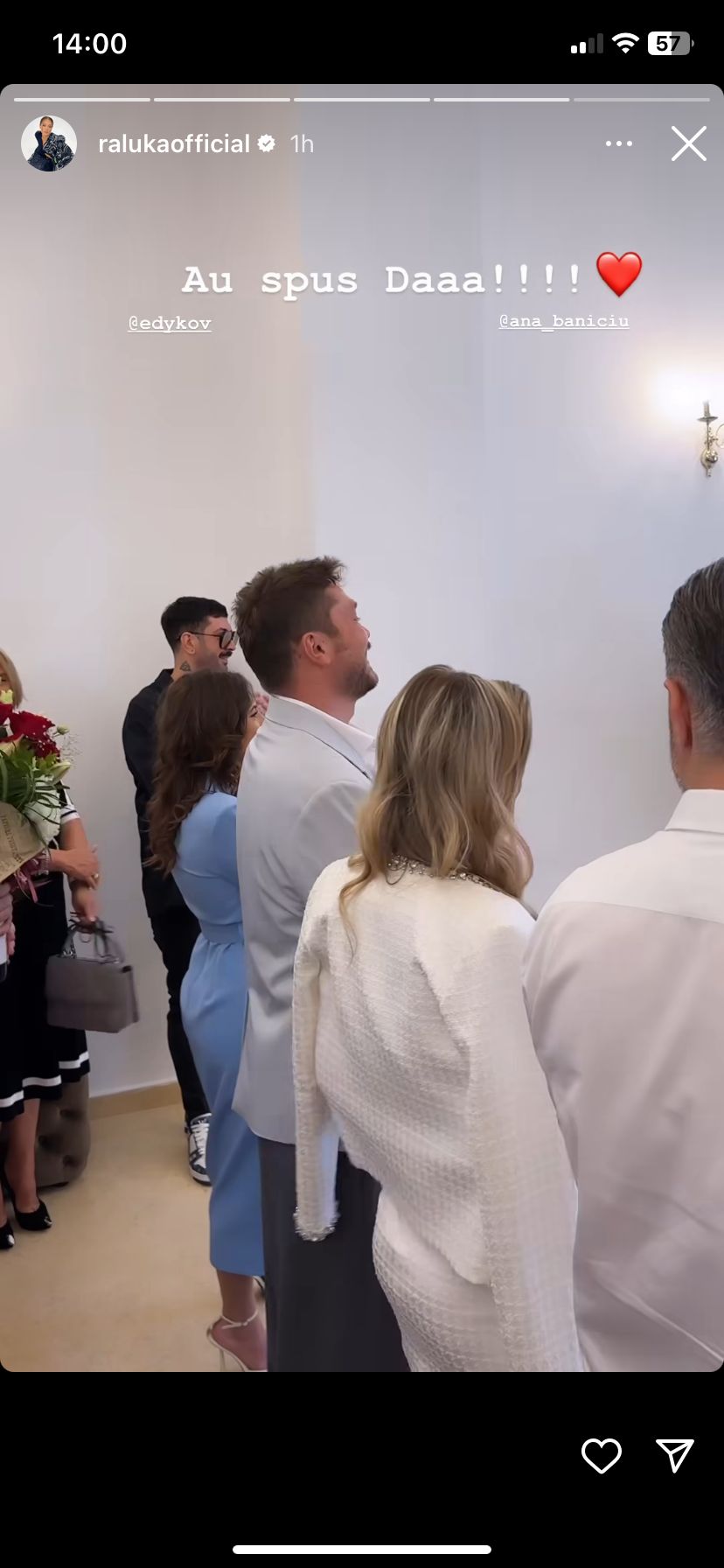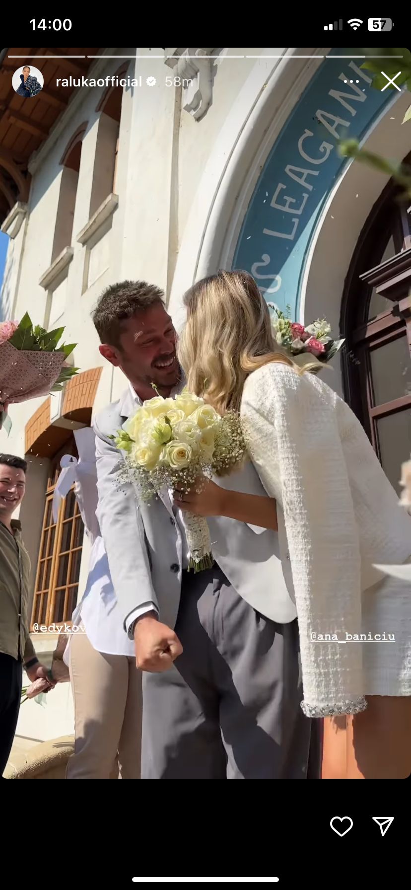Ana Baniciu și Edy Kovasc trăiesc o frumoasă poveste de dragoste de ceva timp, iar astăzi a venit momentul în care își unesc destinele. În urmă cu câteva momente, cei doi au spus „DA” în fața ofițerului stării civile și primele imagini cu proaspeții căsătoriți au fost făcute publice de prietena cea mai bună a artistei, Raluka. Alături de cei doi miri sunt toți cei dragi lor, iar toată lumea, în frunte cu ei, radiază de fericire.