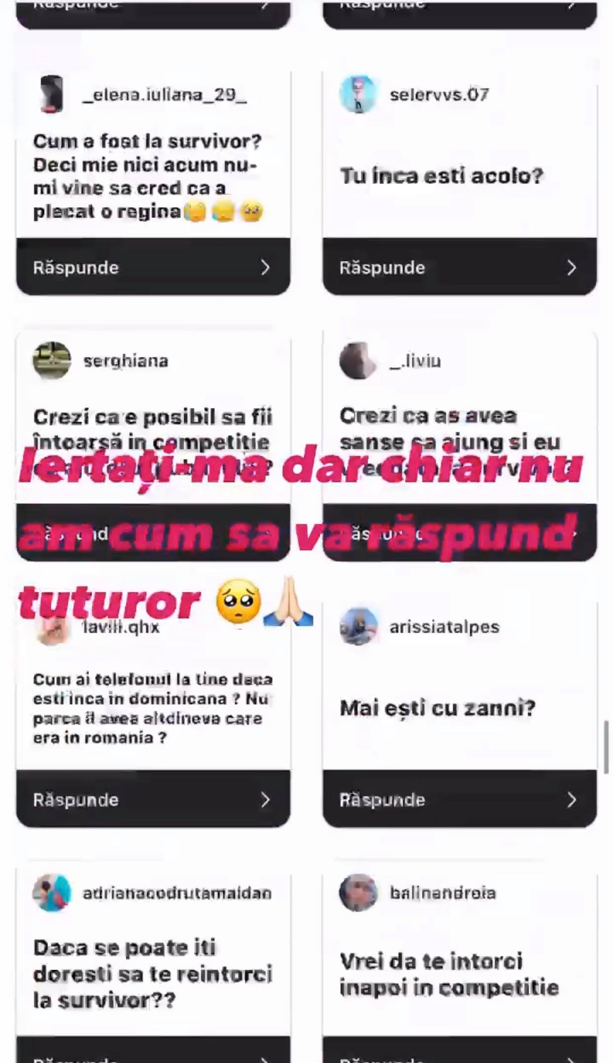 „De când am părăsit competiția, aici, în Dominicană, plouă încontinuu, plouă torențial. Eu mă gândesc că săracii, drăguții mei, pe care i-am lăsat acolo, stau în ploaie și la jocuri sunt uzi rău. Chiar dacă e cald aici în momentul în care plouă, e o ploaie foarte rece și îmi amintesc eu cum eram eu în momentul ăsta și îmi pare foarte rău de ei” a mai dezvăluit Ana pe Instagram.