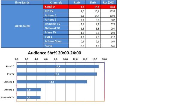 Mai jos, cifre detaliate si audientele inregistrate de Kanal D in luna noiembrie 2016, in Prime Time (20:00 – 24:00):