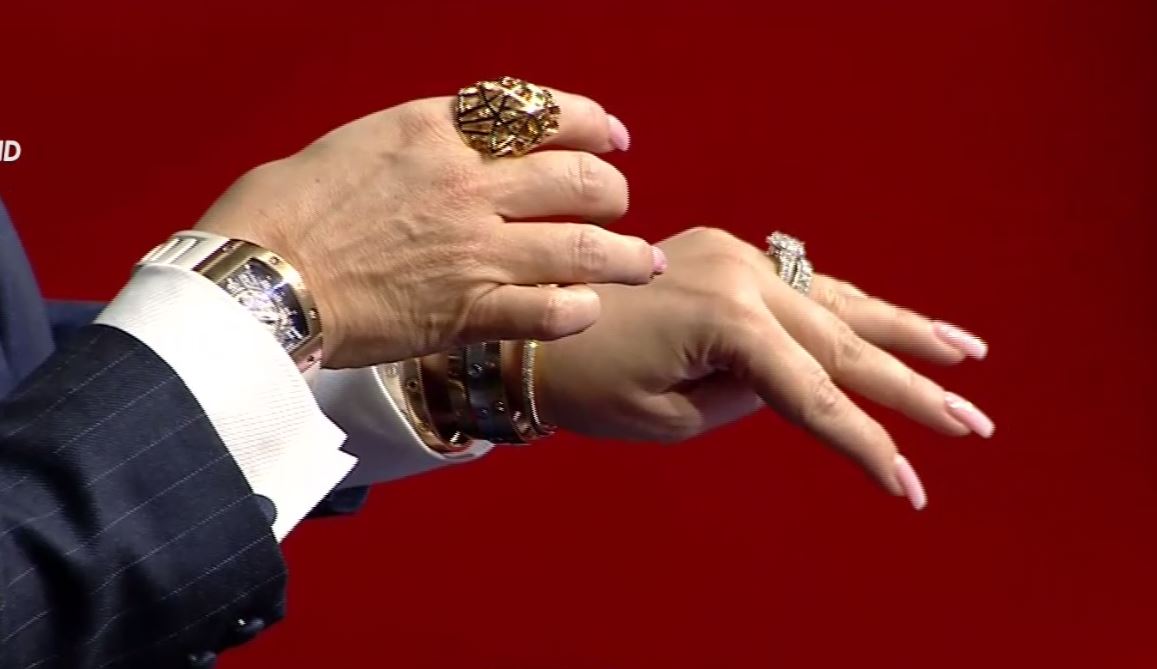 ”Inelul de logodnă, care are diamant de 2,5 carate – 170.000 de euro și inelul de lângă , inelul Cartier (cadou de la Laurențiu Reghecampf) – 30.000 de euro, ceasul Richard Mille – 100.000 și ceva…”, a făcut Anamaria Prodan un calcul rapid al bijuteriilor purtate de ea ăn emisiunea ”40 de întrebări cu Denise Rifai”.