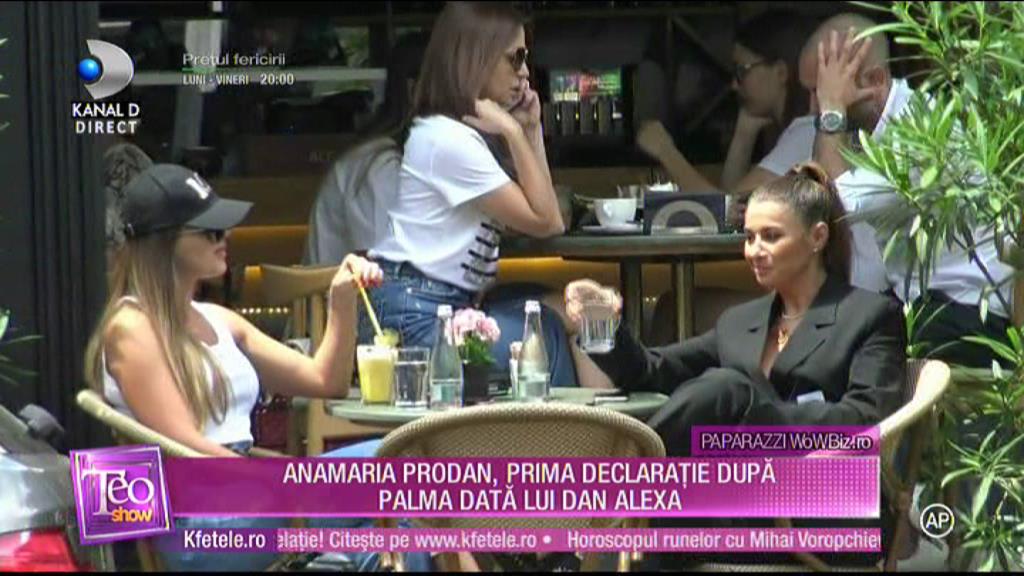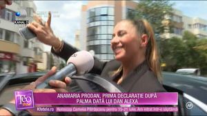 Anamaria Prodan a făcut și o scurtă declarație despre Dan Alexa, antrenorul pe care l-a pocnit sâmbătă seară, după meciul Astra- FC Botoșani. „Sunt ok, sunt perfect. Nimic. Dan Alexa este sufletul meu”, s-a rezumat să declare Anamaria Prodan la Teo Show.