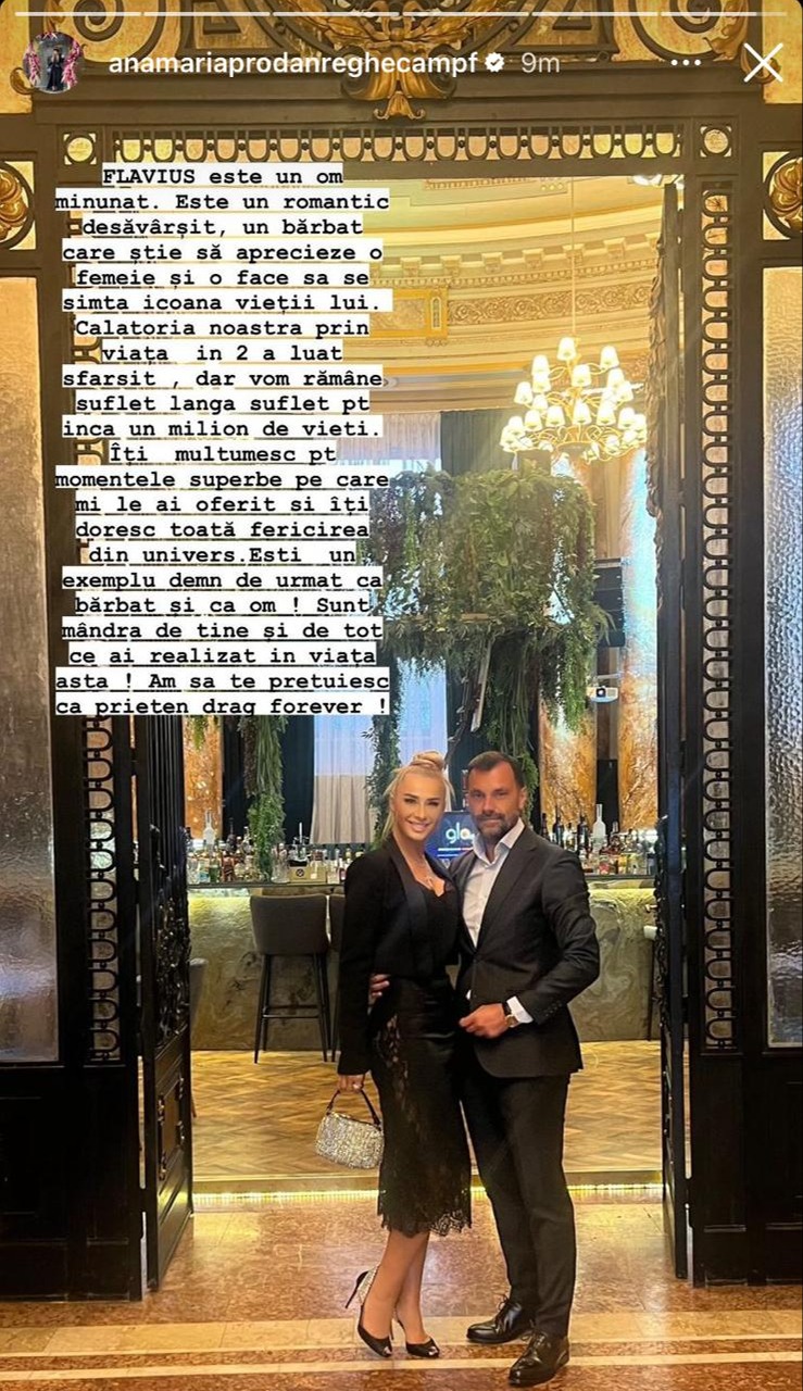 Anamaria Prodan și Flavius Nedelea și-au spus „adio” la mai puțin de o lună de când au decis să foreze un cuplu. Impresara a fost cea care a anunțat despărțirea în mediul online cu doar câteva minute în urmă. La fel de diplomată și discretă cu noua sa relație de iubire, a scris un mesaj cu totul special despre fostul ei iubit. Chiar dacă a fost unul de despărțire, a ales să-i adreseze numai cuvinte de laudă și să-și arate încă o dată aprecierea și respectul pe care i le poartă fostului ei iubit, chiar dacă au format un cuplu pentru o foarte scurtă perioadă.