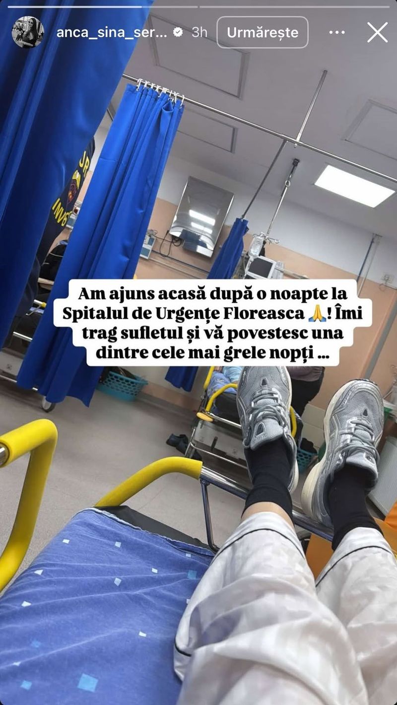Pe pagina sa de Instagram, Anca Serea a publicat o fotografie în care apărea în pijamale pe patul de spital. Alături de imagine, soția lui Adrian Sînă a mărturisit că a trecut prin clipe grele și că și-a petrecut noaptea la Spitalul de Urgențe „Floreasca”.