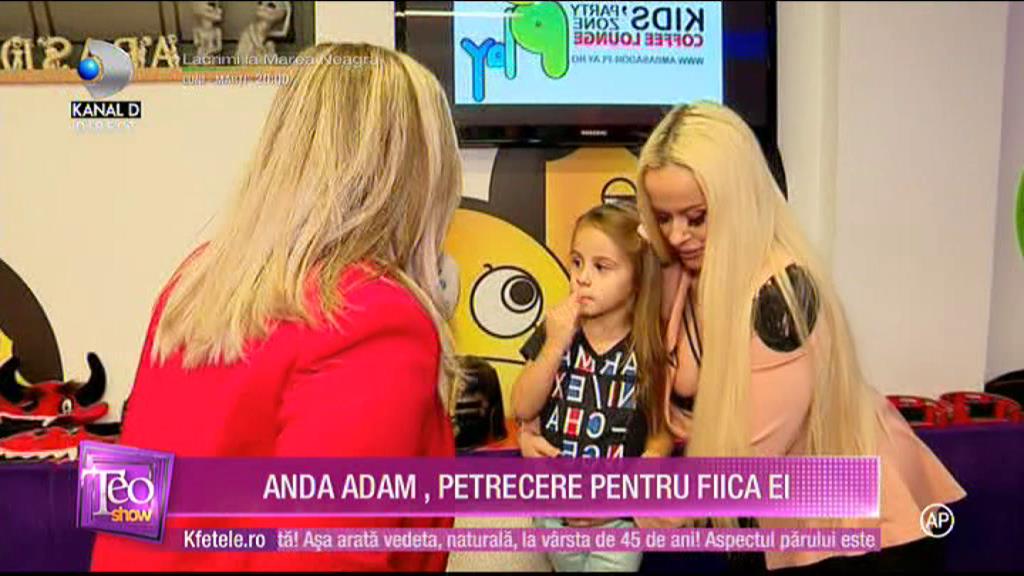 O echipă de filmare de la Teo Show a mers la party-ul dat în cinstea fiicei Andei Adam. Fetița a avut mulți invitați și două torturi, cu personajele de desene animate preferate: Patrula Cățelușilor și SpiderMan. Evelin a stat de vorbă cu reporterul emisiunii Teo Show și a dezvăluit că împlinește 4 anișori, îi place la grădiniță și își dorește foarte mult un frățior.
