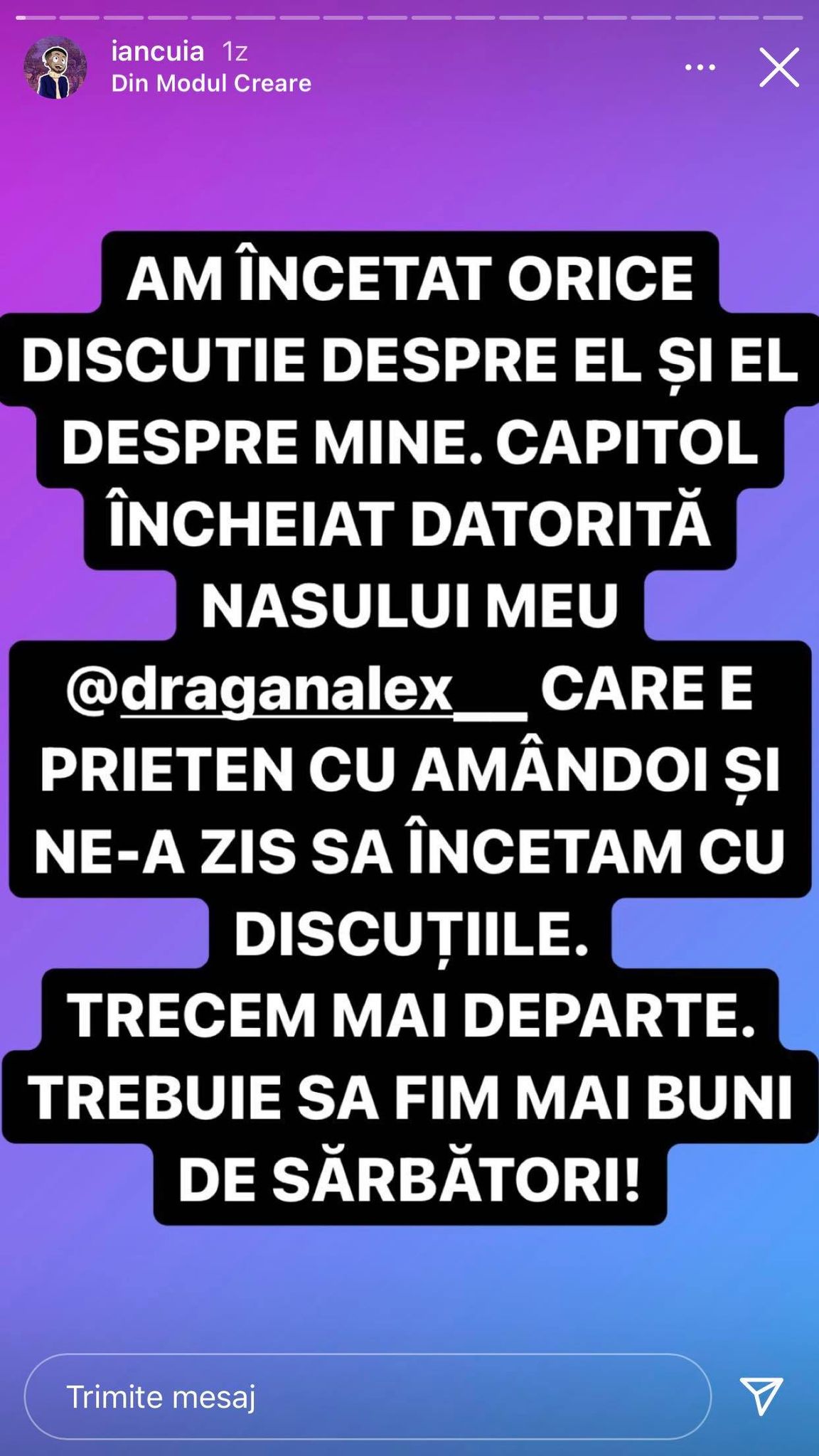 Trecem mai departe. Trebuie să fim mai buni de sărbători”, a scris Adrian Iancu, pe contul lui de Instagram.