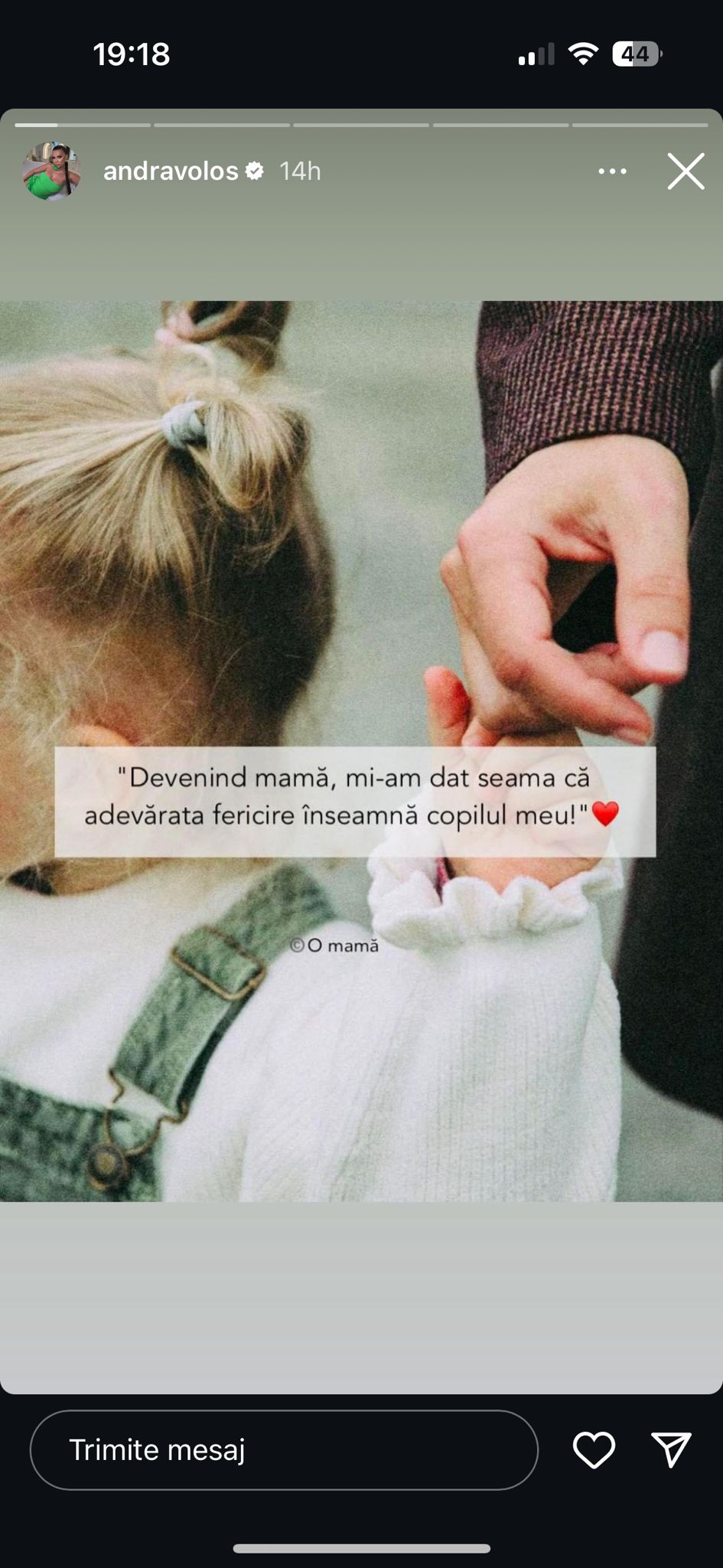 „Devenind mamă, mi-am dat seama că adevărata fericire înseamnă copilul meu”, a fost mesaj postat de vedetă pe pagina de Instagram, la secțiunea InstaStory.