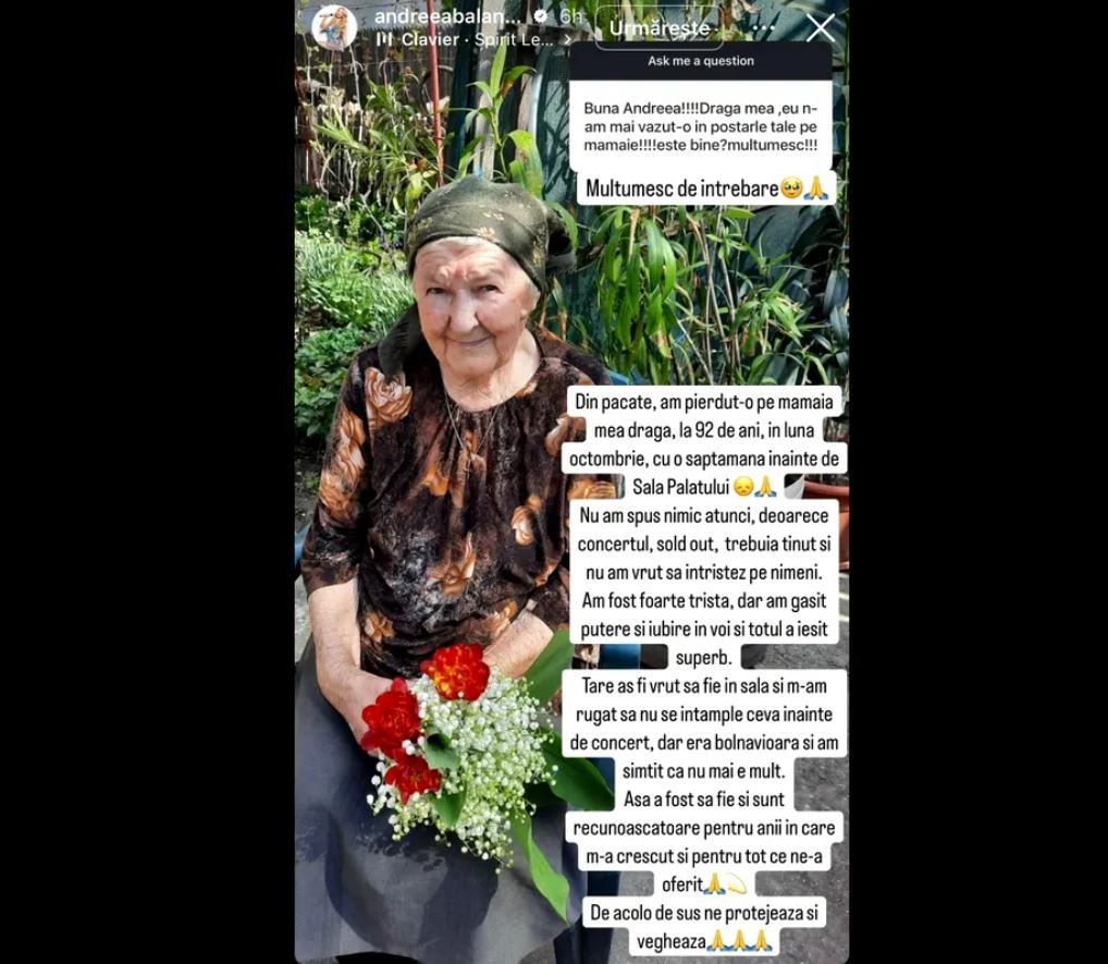 Andreea Bălan a făcut o dezvăluire cu care a reușit să-i surprindă pe toți, aceea că bunica ei, care a crescut-o și care i-a fost alături la tot pasul, a decedat.