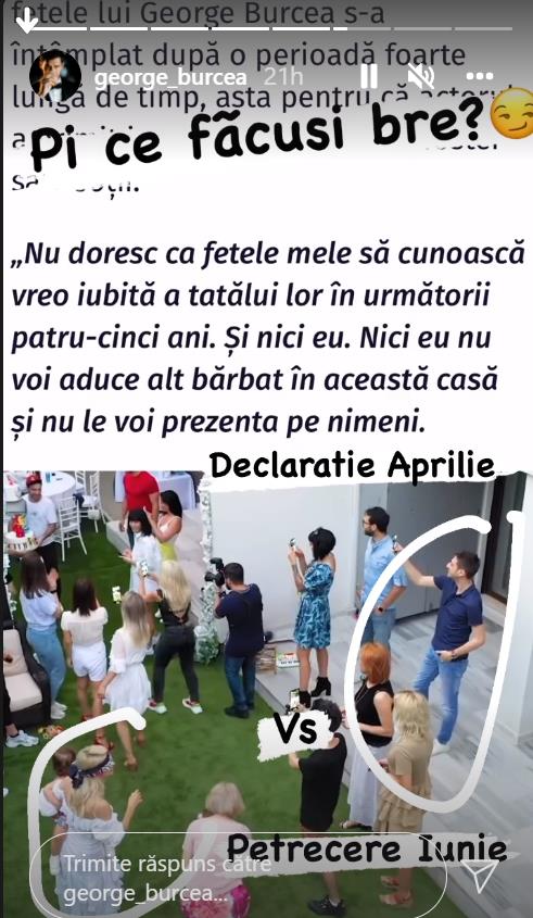 George Burcea a apelat la pagina sa de Instagram pentru a dovedi că Andreea Bălan nu și-a ascultat propriul sfat. La doar câteva luni după ce a declarat cele spuse mai sus, Andreea Bălan l-a adus acasă pe Tiberiu Argint, alături de care forma un cuplu la vremea respectivă. „Păi ce făcuși, bre?”, a scris George Burcea la Instastory, alături de fotografia în care apar atât Tiberiu Argint, cât și Andreea Bălan.