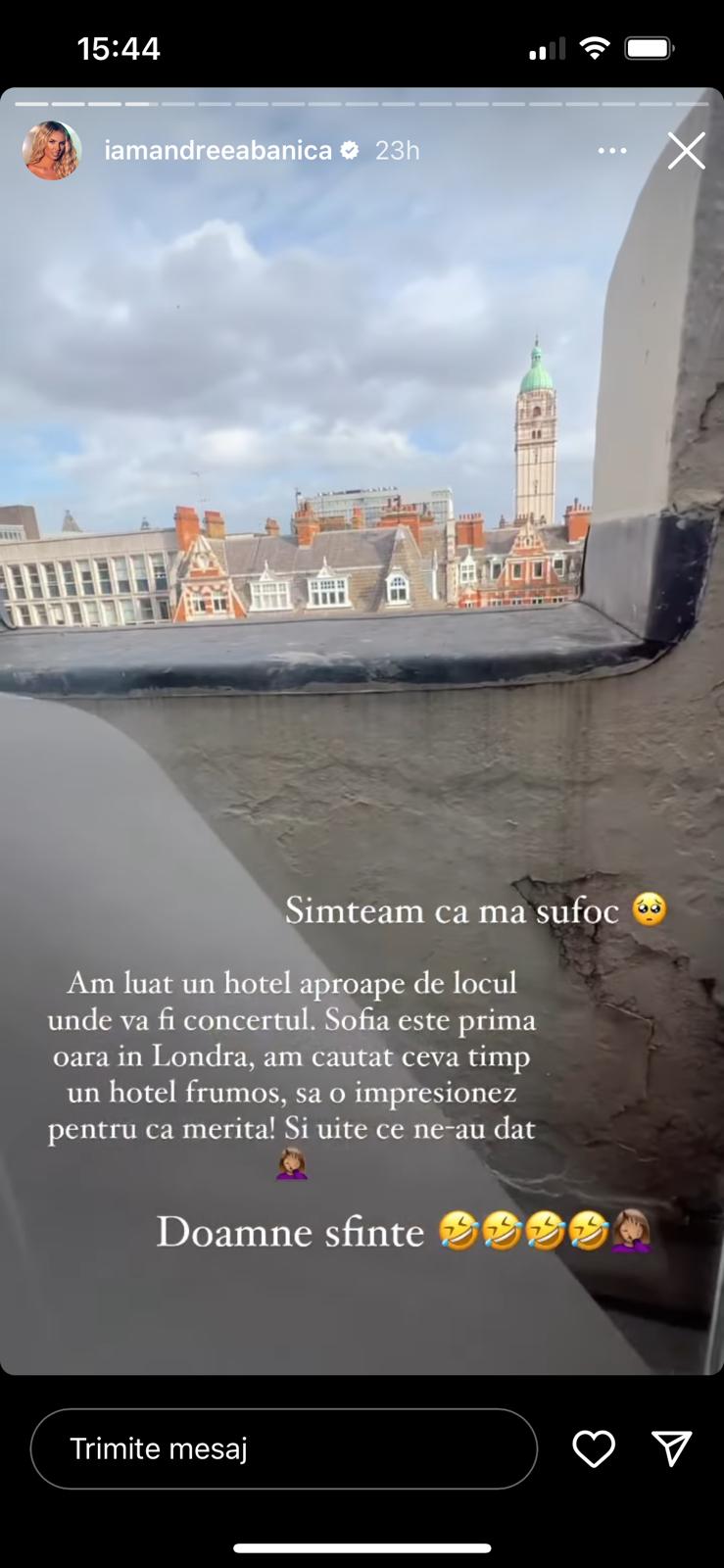 Simțeam că mă sufoc. Am luat un hotel aproape de locul unde va fi concertul. Sofia este pentru prima oară în Londra, am căutat ceva timp un hotel frumos, s-o impresionez pentru că merită! Și uite ce ne-au dat! Doamne sfinte!'', a declarat Andreea Bănică pe rețelele de socializare.