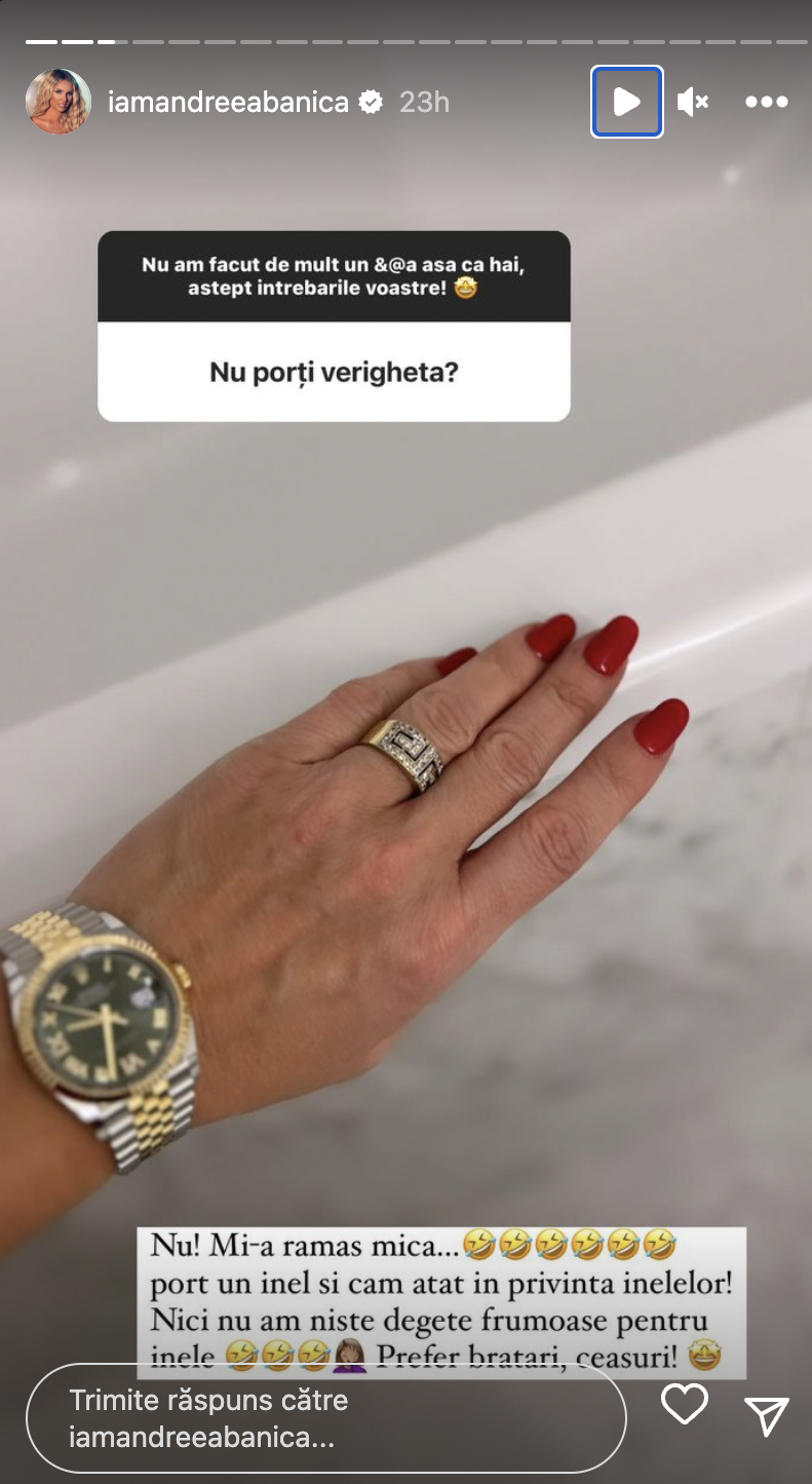 „Nu! (n.r. nu mai poartă verigheta). Mi-a rămas mică… Port un inel și cam atât în privința inelelor! Nici nu am niște degete frumoase pentru inele. Prefer brățări, ceasuri.”, a scris Andreea Bănică pe InstaStory.