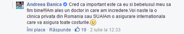 “Cred ca important este ca eu si bebelusul meu sa fim bine! Am ales un doctor in care am incredere. Voi naste la o clinica privata din Romania sau SUA! Am o asigurare internationala care va acoperi toate costurile”, a scris ea pe pagina de socializare.