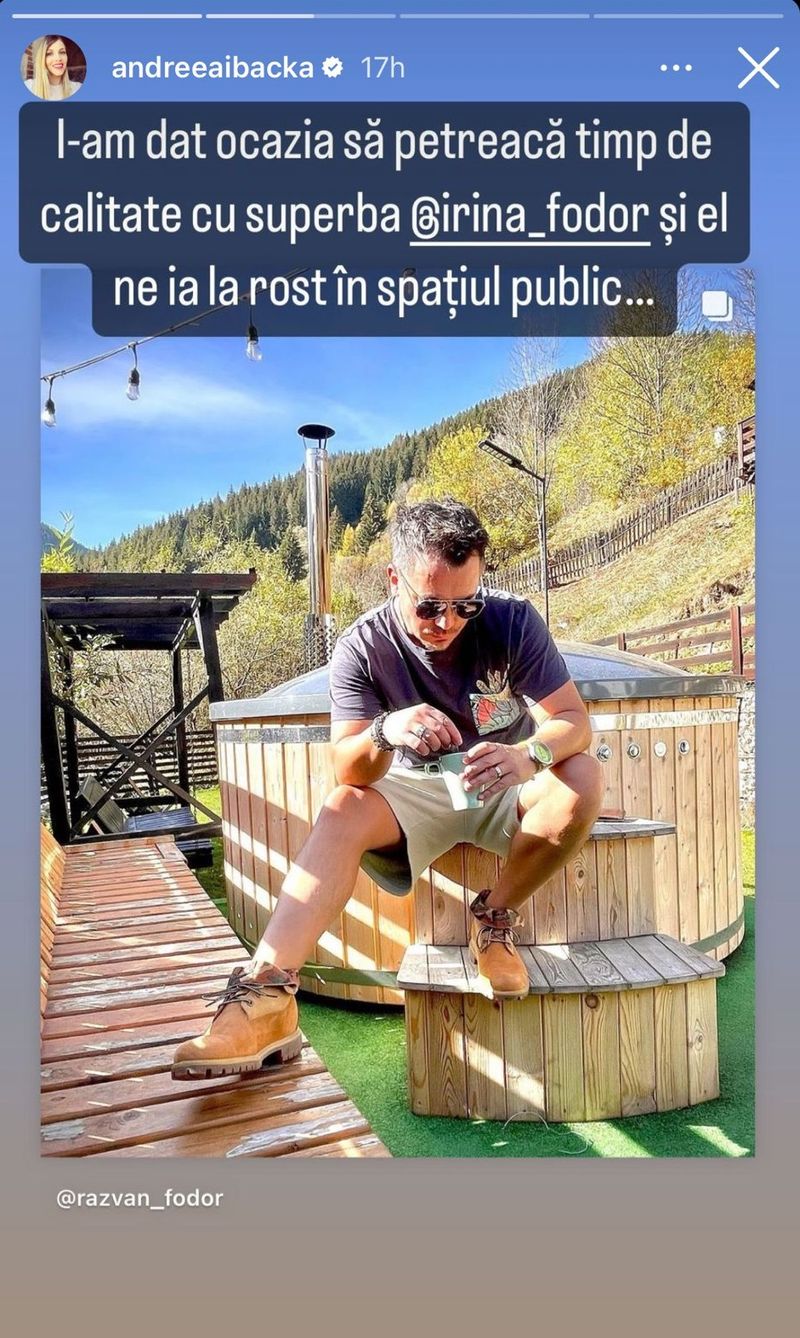 Imediat după filmulețul postat, Andreea, deranjată de atitudinea nașului ei, însă totul într-o formă de glumă, i-a transmis și ea câteva cuvinte, asigurându-l că a fost o strategie pentru a-l lăsă să petreacă timp cu soția lui: „I-am dat ocazia să petreacă timp de calitate cu superba Irina Fodor și el ne ia la rost în spațiul public.”