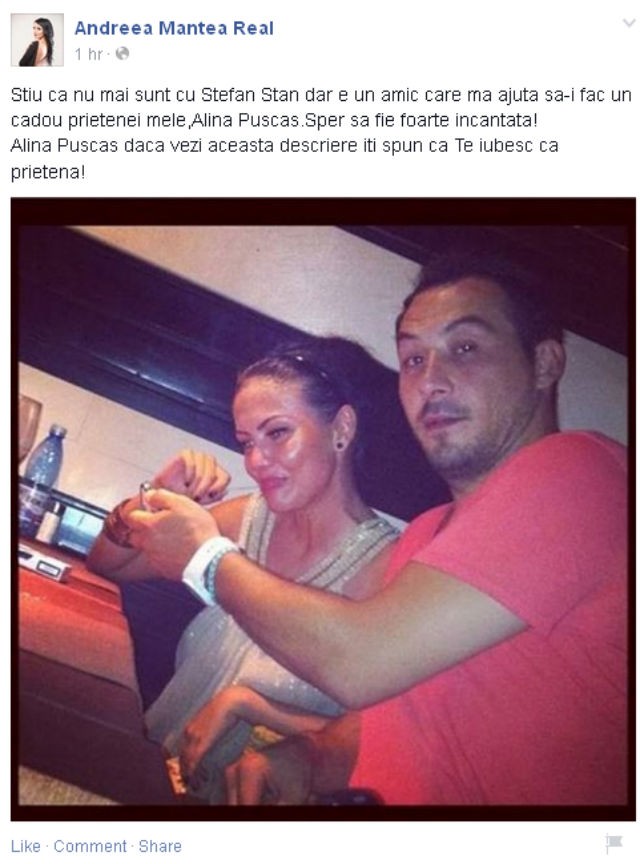 „Ştiu că nu mai sunt cu Ştefan Stan, dar e un amic care mă ajută să-i fac un cadou prietenei mele, Alina Puşcaş.Sper să fie foarte încântată! Alina Puşcaş dacă vezi această descriere îţi spun că Te iubesc ca prietenă!”, a scris persoana care a creat contul pe pagina de socializare.