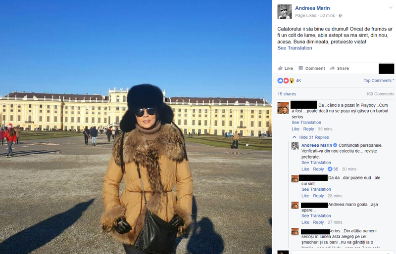 Rautaciosii nu s-au putut abtine de la comentarii. Unul dintre prietenii virtuali a spus ca vedeta ar fi pozat in Playboy, iar pozele explicite ar fi fost motivul pentru care nu a gasit un barbat care sa ramana alaturi de ea. Enervata de comentariul barbatului, Andreea Marin i-a raspuns: „Confundati persoanele. Verificati-va din nou colectia de… reviste preferate”, a replicat vedeta.