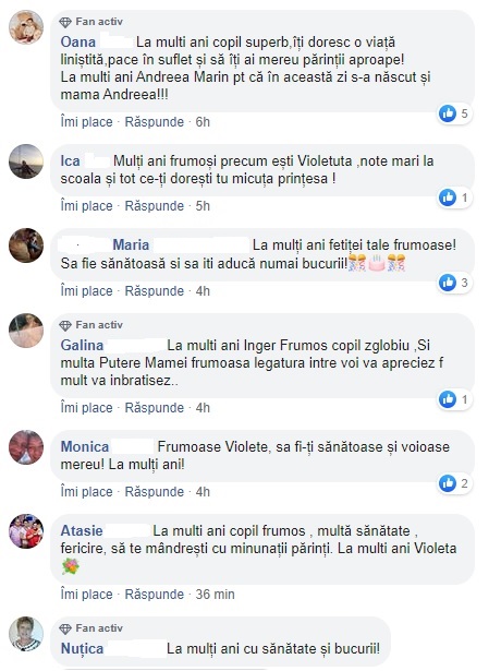Foarte multe persoane care o apreciaza pe vedetă au dorit să îi transmită Violetei urări de bine, cele de mai sus fiind puține în comparație cu numărul real al fanilor care au dorit să ia parte la bucuria Andreei Marin, de ziua fiicei sale.
