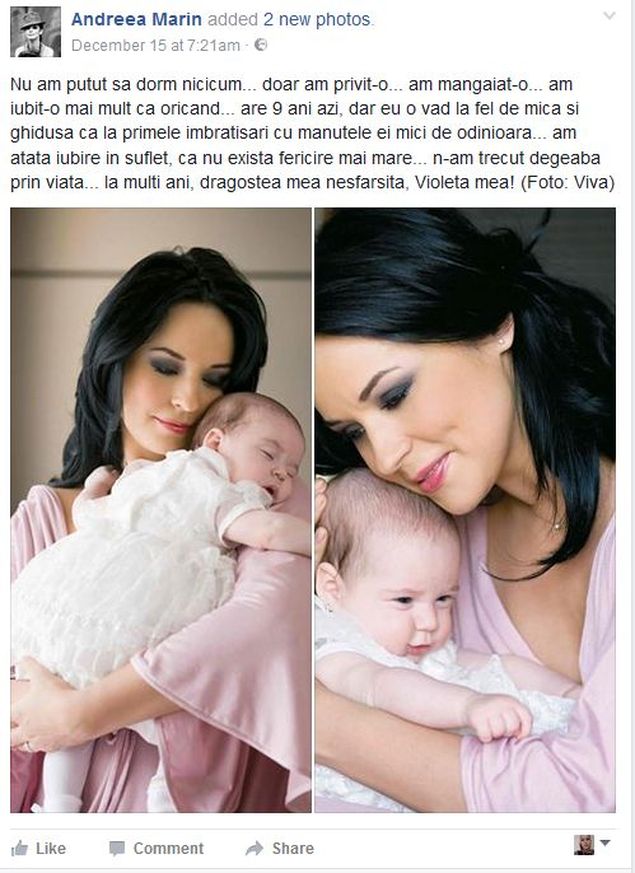 De ziua Violetei, fiica pe care o are cu Stefan Banica Jr, Andreea Marin a publicat pe Facebook o poza cu ea si fiica ei, dar si un mesaj.