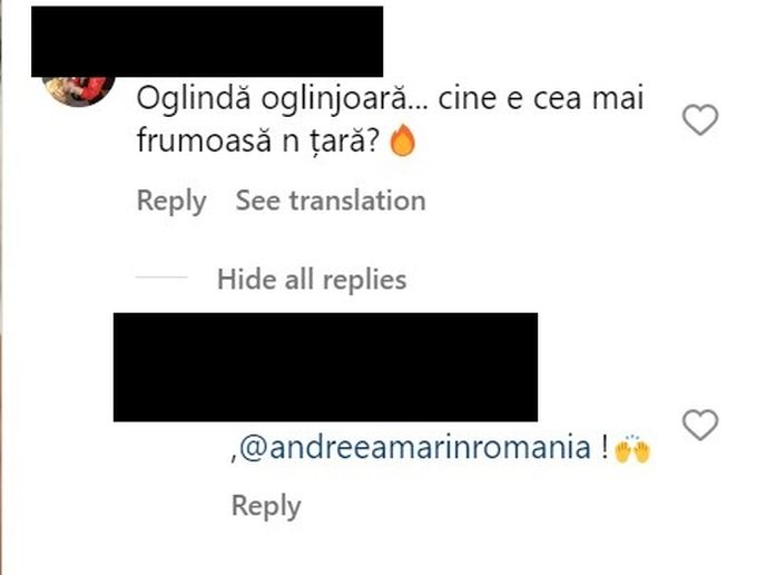 Răspuns: Andreea Marin!”, a fost schimbul de replici pe care cele două urmăritoare ale Laviniei Pîrva l-au avut, în secțiunea de comentarii de la postarea vedetei.