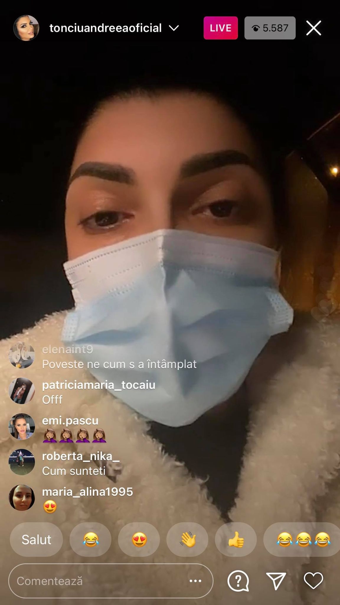 „Bună dimineața! Eu acum am ieșit din casă. Mă duc că am puțină treabă. Rebi a rămas acasă momentan, pentru că este puțin bolnăvioară, dar o să-și revină curând. De aia am fost absentă, pentru că ieri am ajuns cu ea la spital, dar totul este în regulă, sunt foarte liniștită, cu toate că eu sunt o persoană care sunt foarte panicată, de fiecare dată fac ca toată alea, dar are o mică răceală, pot spune.Vă pup!”, a explicat Andreea Tonciu, la InstaStory.