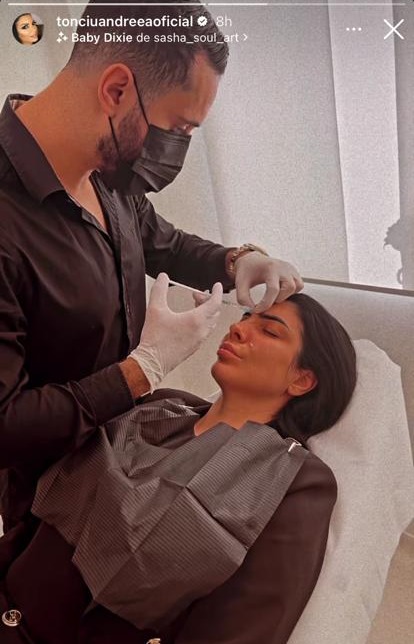 „Dragele mă pregătesc intens pentru vacanța din Dubai și am venit la domnul doctor să mă injectez puțin pentru că nu îmi mai place cum arăt. Așa că stați aici la mine să vedeți finalul!”, le-a spus Andreea Tonciu fanilor de pe Instagram.
