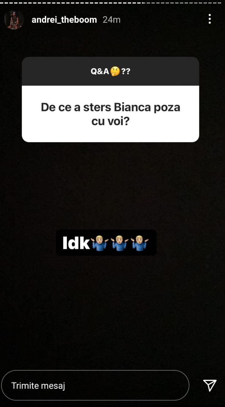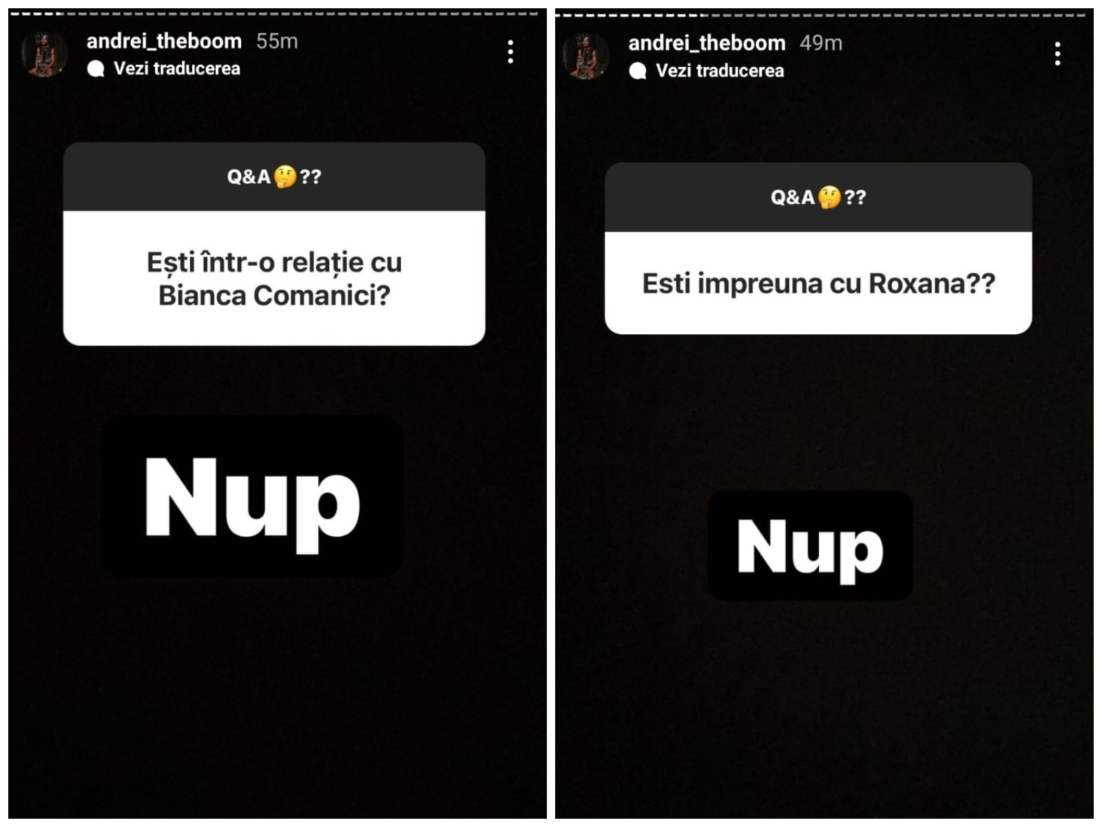 Andrei Dascălu a anunțat oficial că s-a despărțit de Roxana Ghiță, pe pagina lui de Instagram. El a organizat recent o sesiune de întrebări cu fanii lui, cărora le-a mărturisit că mai este cu Războinica. Printre cele mai multe întrebări se regăseau cele care fac referire la legătura dintre el și Bianca Comănici, alături de care s-a afișat tot mai des în ultima perioadă. Bruneta a distribuit recent o poză cu ei pe pagina sa de Instagram, pe care ulterior a șters-o. Fostul concurent de la Survivor România le-a recunoscut fanilor că nu știe de ce Bianca Comănici a luat această decizie.