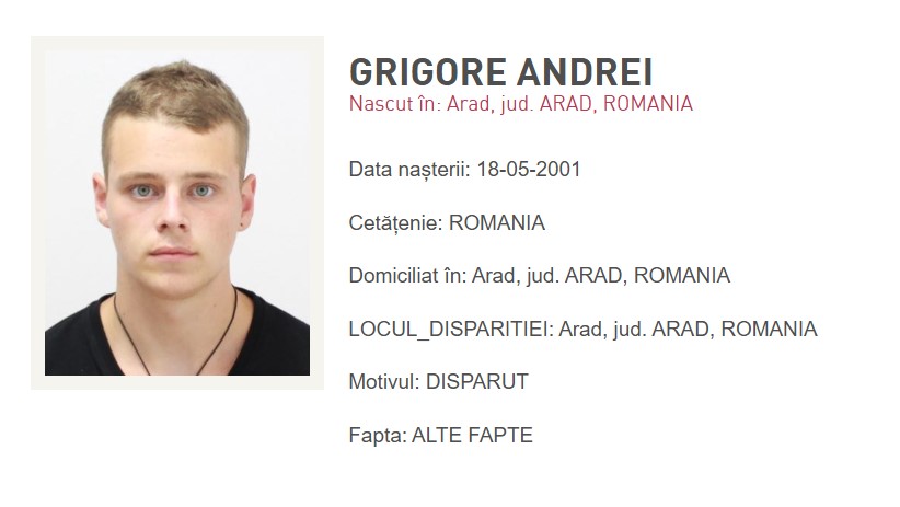 Autoritățile sunt în alertă după ce au fost anunțate de dispariția unui tânăr în vârstă de 23 de ani. Andrei Grigore a dispărut din Arad în urmă cu trei zile, atunci când a plecat de acasă. Nu s-a mai întors, iar nimeni nu poate da de el.