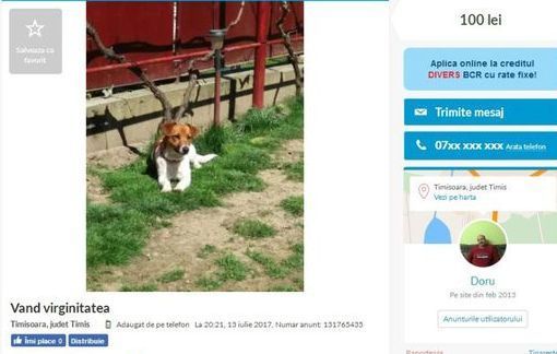 Un barbat din Timisoara a postat un anunt care i-a amuzat pe internauti. Acesta a anuntat ca vinde virginitatea catelusei sale.
