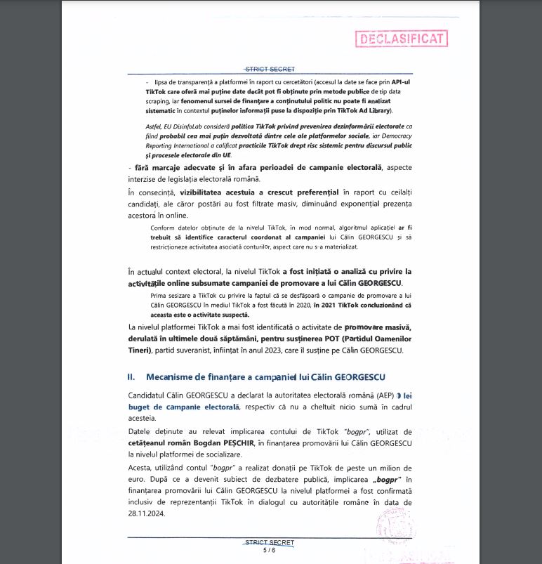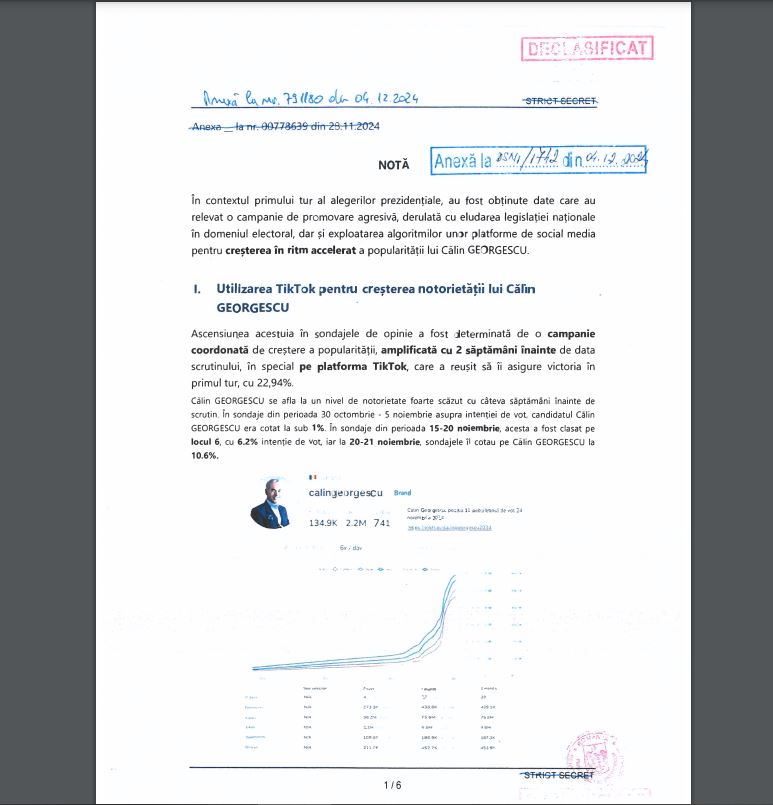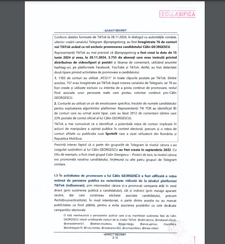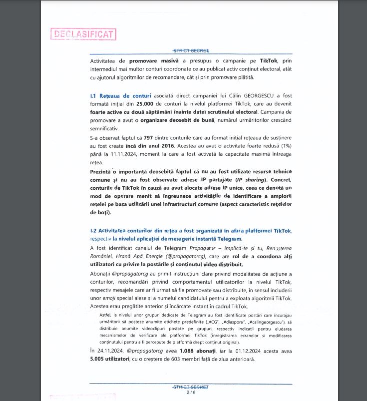 Klaus Iohannis a declasificat documentele prezentate în ședința CSAT și SRI a găsit peste 700 de conturi de TikTok create încă din anul 2016 și folosite în campania electorală a lui Călin Georgescu anul acesta. În acest sens, SRI precizează că rețeaua de conturi asociată direct campaniei candidatului la prezidențiale a fost formată, în primă fază, din 25.000 de conturi de TikTok, care au devenit foarte active abia înainte de primul tur al alegerilor.
