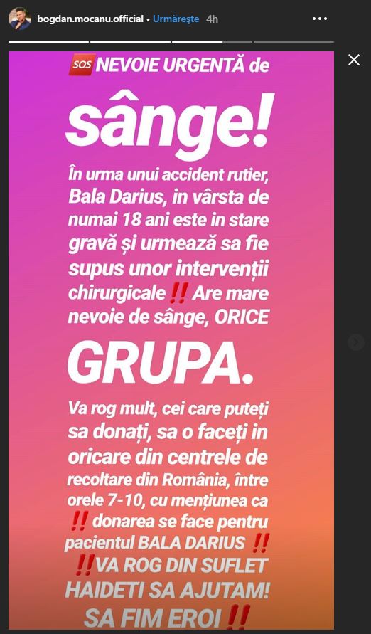 Vă rog mult, cei care puteți să donați, să o faceți în oricare din centrele de recoltare din România, între oerle 7-10, cu mențiunea că donarea se face pentru pacientul Bala Darius. Vă rog din suflet, haideți să ajutăm! Să fim eroi!”, este mesajul pe care Bogdan Mocanu de la Puterea Dragostei l-a publicat pe pagina lui de Instagram, în speranța că măcar câțiva dintre cei aproape 400 de mii de fani vor sări în ajutorul băiatului de 18 ani.