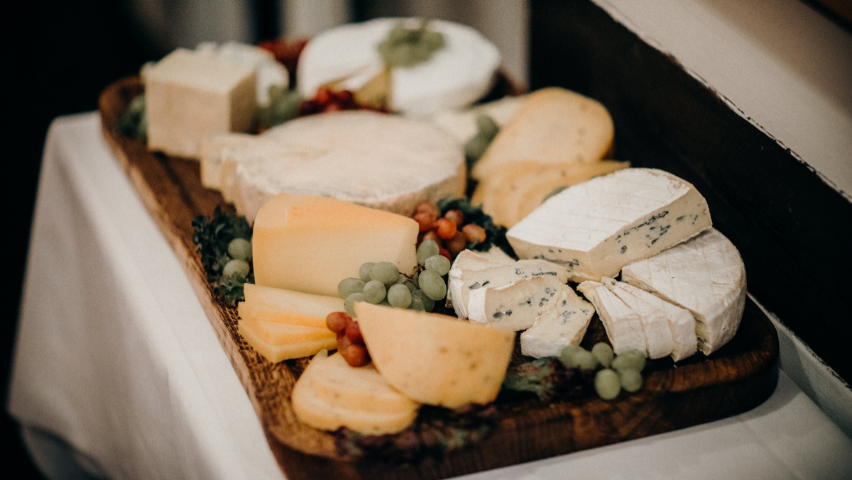 Platou de brânzeturi și mezeluri câteva feluri de brânză: afumată, cu mucegai, cremoasă 3-4 feluri de fructe proaspete, smochine, nectarine, pepene galben, struguri fructe deshidratate, curmale, prune, caise biscuiți sărați miere, dulceață, piure de fructe nuci, alune, migdale, fistic prosciutto, salam italienesc, chorizo.