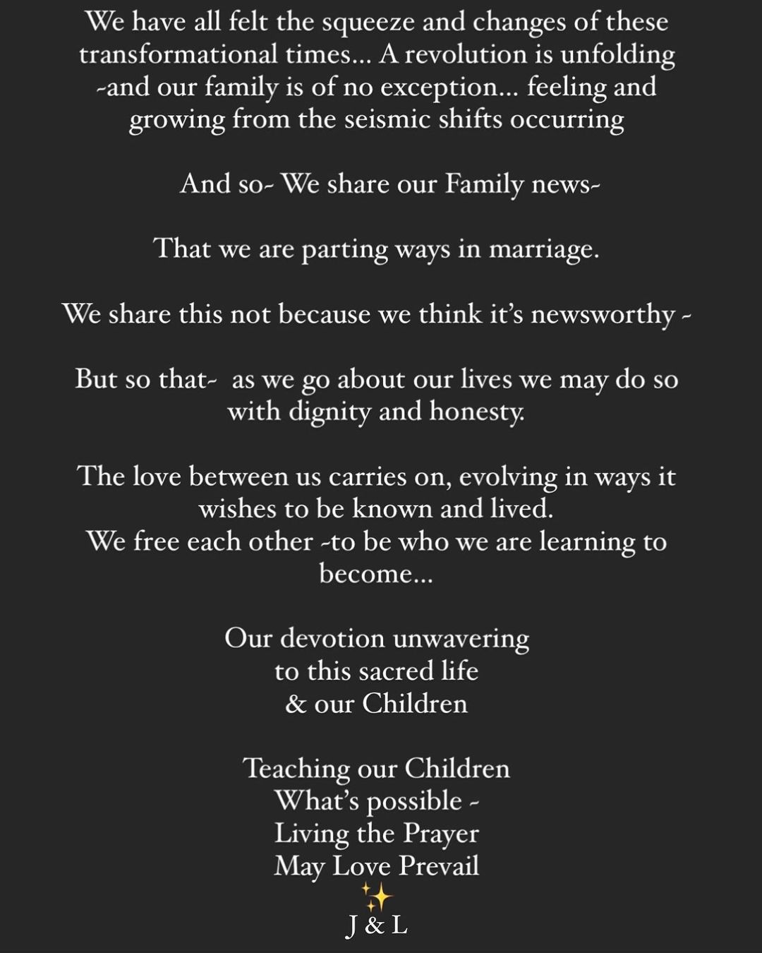 „Toți am simțit apăsarea și schimbările acestor timpuri transformatoare…Începe o revoluție, iar familia noastră nu face excepție…Simțim și creștem din aceste schimbări cutremurătoare. Așa că împărtășim veștile despre familia noastră. Vom desface căsnicia noastră. Împărtășim acest lucru nu pentru că am crede că trebuie să apară în presă. Facem asta ca să ne trăim viețile cu demnitate și sinceritate. Iubirea noastră trăiește în continuare, evoluând în modurile în care își dorește să fie cunoscută. Ne eliberăm unul pe celălalt, ca să fim ceea ce învățăm să devenim. Devotamentul nostru este de nestrămutat pentru această viață sacră și pentru copiii noștri. Îi învățăm pe copii ce este posibil. Trăim în rugăciune. Fie ca dragostea să învingă!”, sunt cuvintele pe care Jason Momoa și Lisa Bonet le-au transmis urmăritorilor lor.
