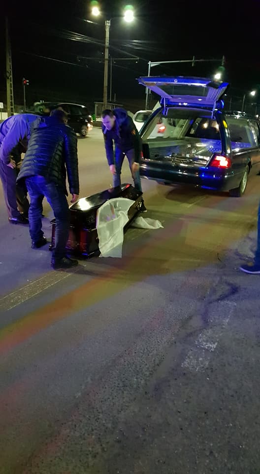 „Informaţiile noastre însă ne spun că nu s-a întâmplat nimic grav, mașinile s-au oprit la timp, sicriul a crăpat nițel, dar nu din cauza celui dinăuntru, ci din cauza șocului cu asfaltul.