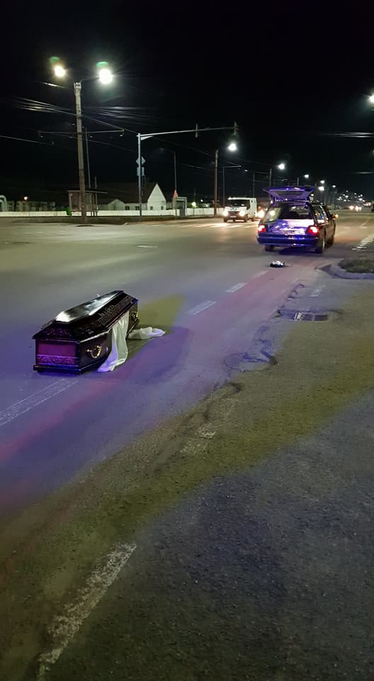 Un caz bizar a avut loc în Arad. Un sicriu a căzut dintr-o mașină pe stradă, în timp ce mașina circula.