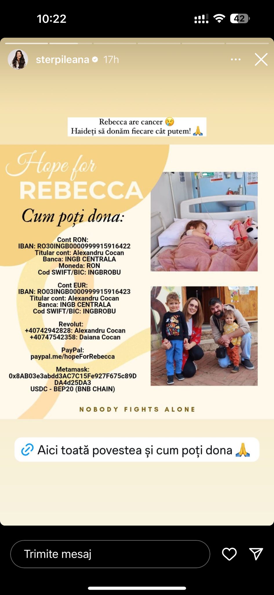 În acest sens, Ileana Sterp i-a încurajat pe urmăritorii de pe Instagram să doneze pentru micuța Rebecca, pentru ca aceasta să se facă bine.