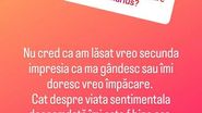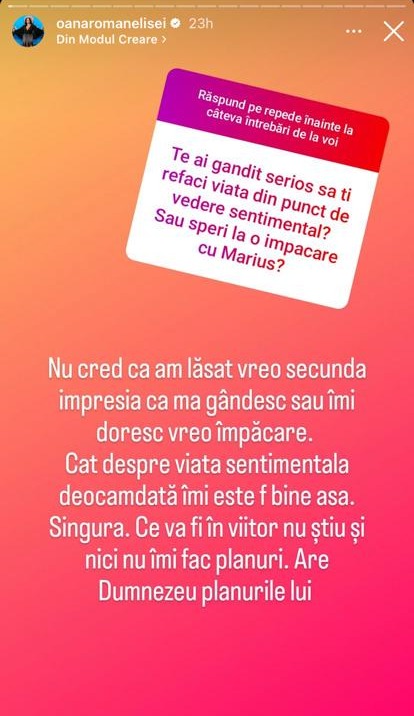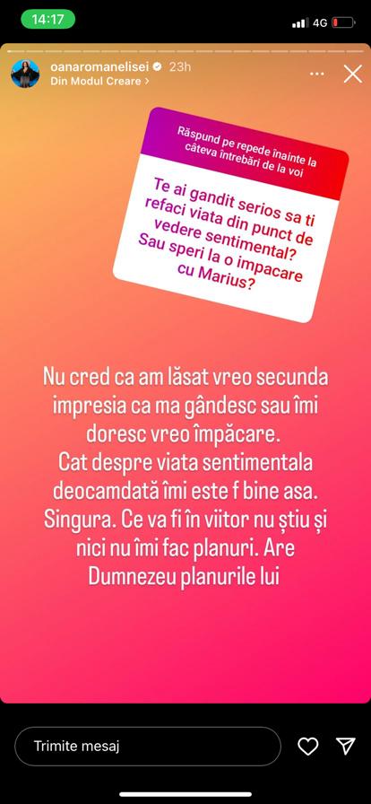 Recent, în cadrul unei sesiuni de întrebări lansată în mediul online, Oana Roman a răspuns clar și răspicat că nu își mai dorește să reia o relație cu Marius Elisei, lămurindu-i pe fani și despre planurile pe care le are în plan sentimental.