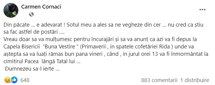 „Din păcate…e adevărat! Soţul meu a ales să ne vegheze din cer … nu ced că ştiu să fac astfel de postări…. Vreau doar să mulţumesc pentru încurajări şi să vă anunţ că azi va fi depus la Capela Bisericii ” Buna Vestire”, Primăverii, (…) unde vă aşteaptă să vă luaţi rămas bun până vineri, când, în jurul orei 13 va fi înmormântat la cimitirul Pacea lângă tatăl lui… Dumnezeu să îl ierte”, a fost mesajul lui Carmen Cornaci pe pagina sa de Facebook.