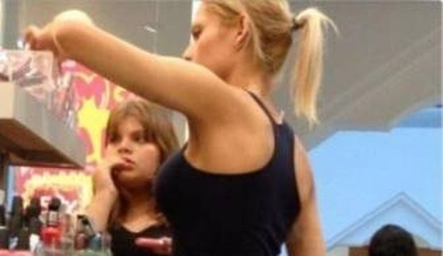 Blonda din imagini a avut proasta inspiratie de a purta niste colanti de culoarea pielii, insa nenorocul ei a fost pe placul barbatilor care si-au clatit din plin ochii.