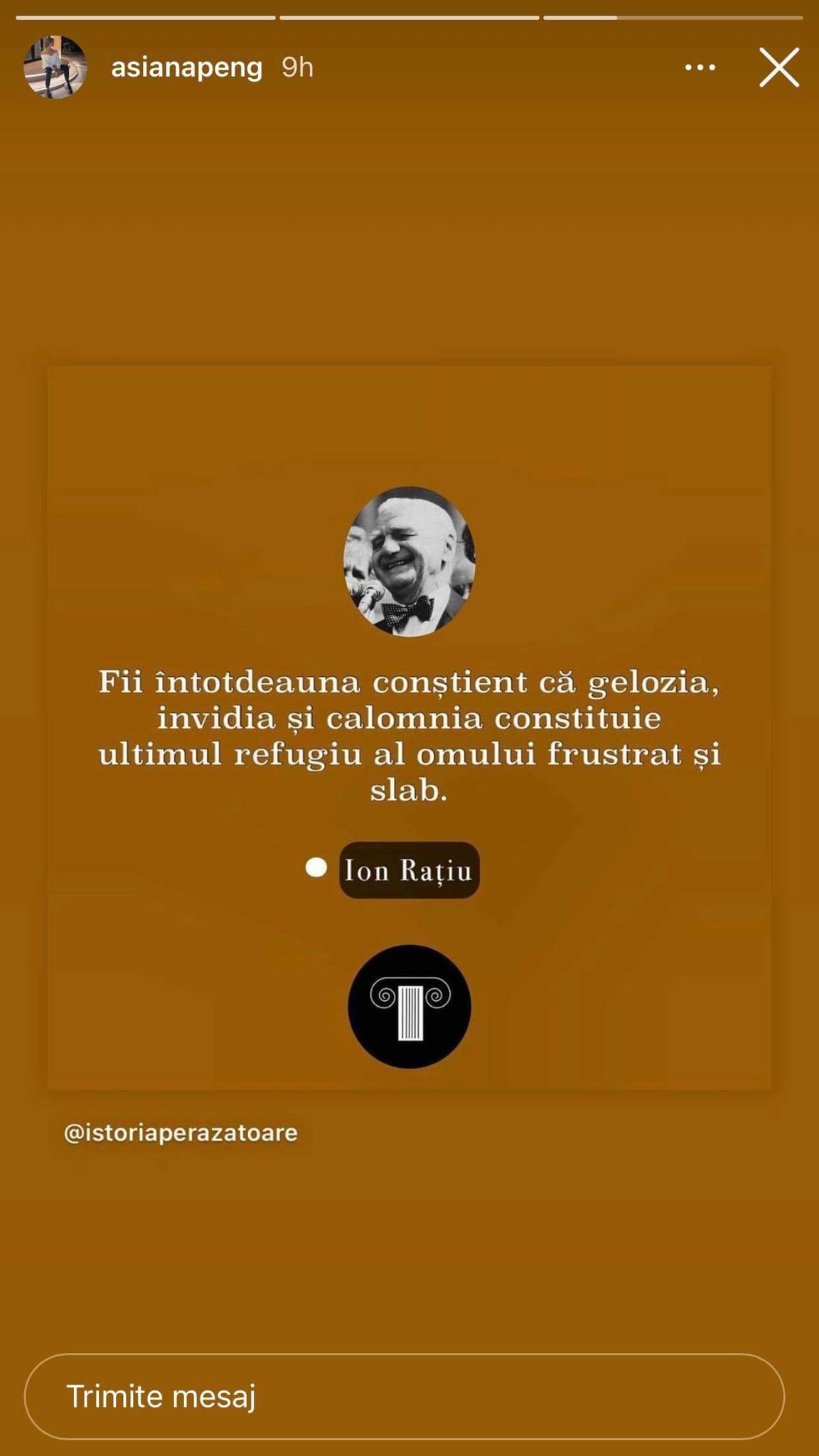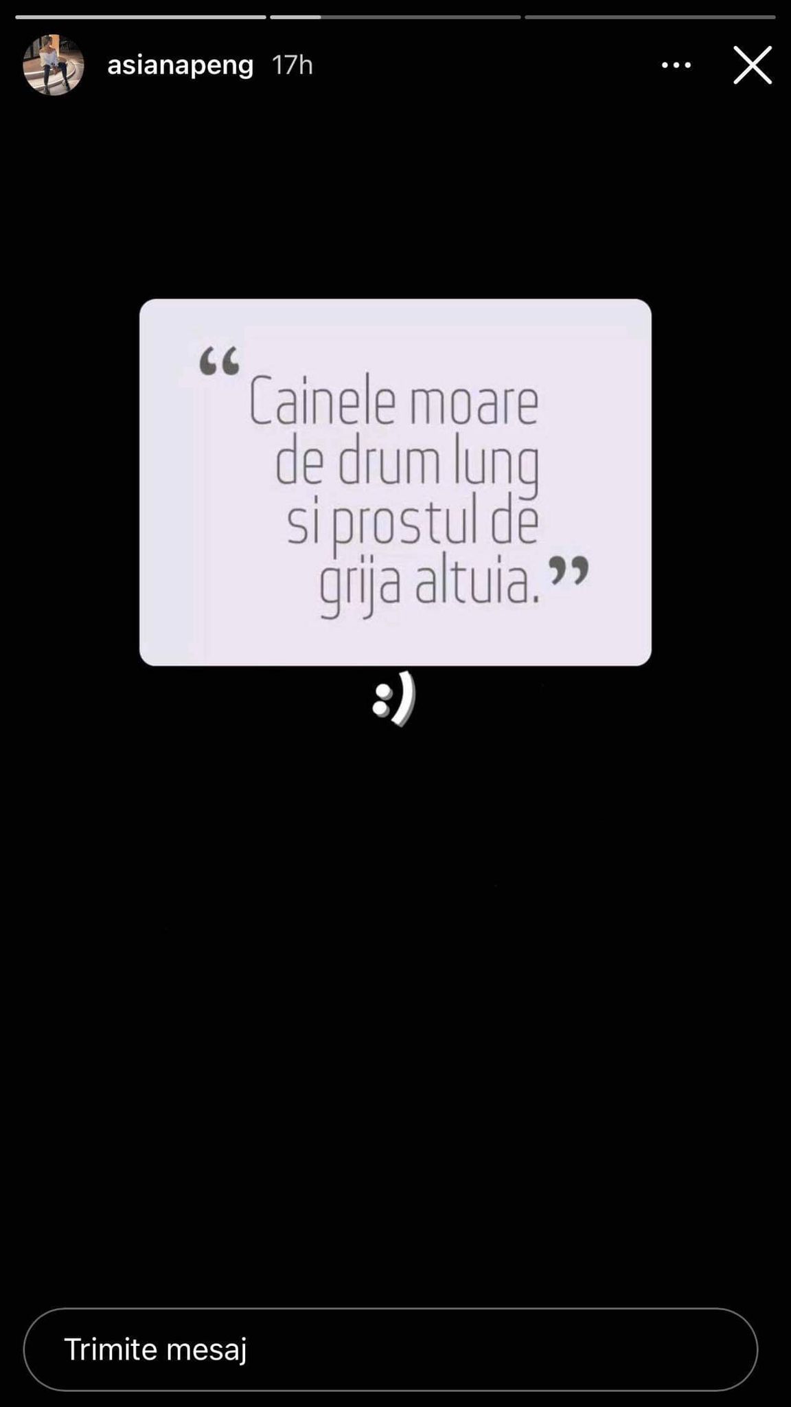 Asiana Peng a avut câteva reacții pe Instagram, la scurt timp după ce mama ei a criticat-o public pe Anamaria Prodan. Fosta sportivă a ținut să spună câteva cuvinte pentru cei care-și dau cu părerea, în necunoștință de cauză: ”Câinele moare de drum lung și prostul de grija altuia”, a fost unul dintre mesajele postate de Asiana.