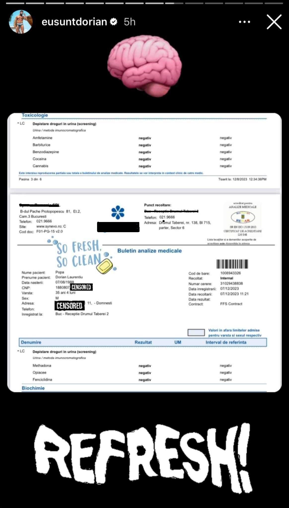 Pe Instagram, acolo unde este foarte activ și unde are o mare comunitate de fani, cântărețul a publicat rezultatul analizelor recent efectuate, care arată că a fost testat negativ la toate substanțele interzise.