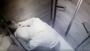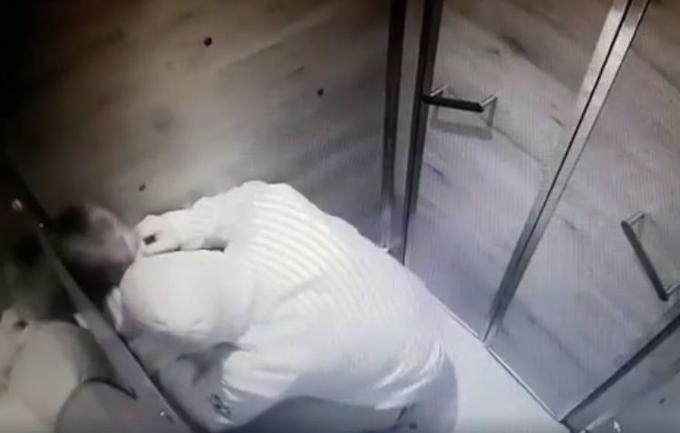 Surprins in fata liftului, in imagine se mai poate vedea si unul din copii aflat in spatele lui, semn ca barbatul a fost cel care i-a bagat in lift pe cei doi micuti.
