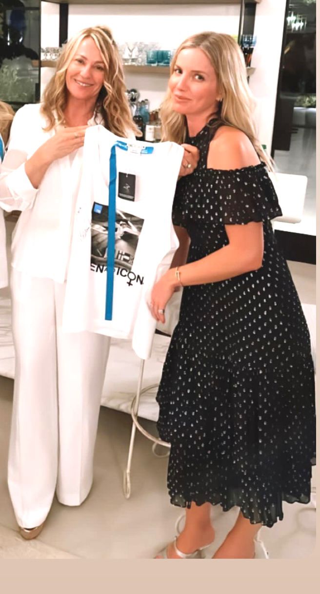 Nadia Comăneci alături de actrița Annabelle Wallis, în momentul în care îi oferă tricoul semnat