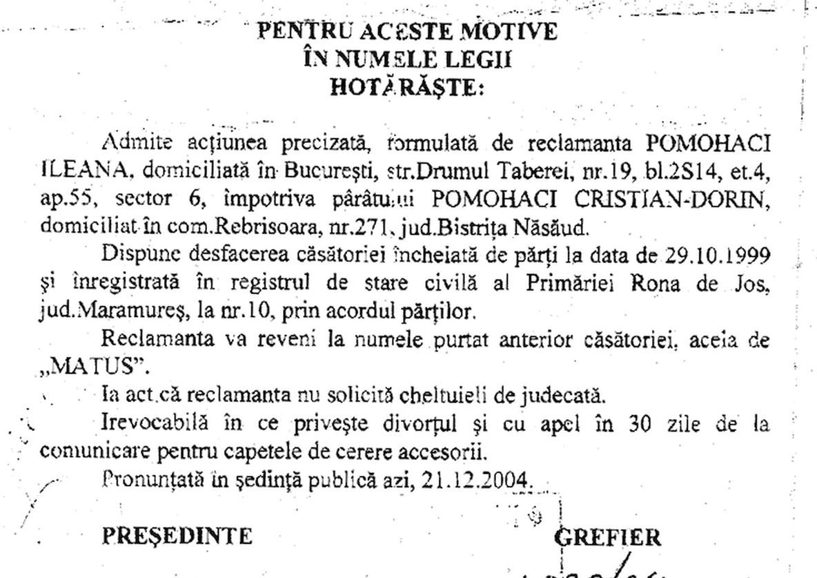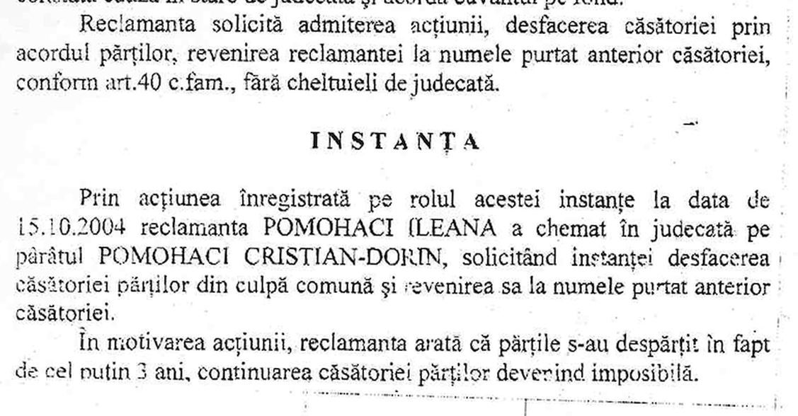 Ileana este cea care a intentat divortul, iar in motivarea actiunii, ea a sustinut ca Pomohaci nu si-a indeplinit atributiile de sot timp de mai multi ani.