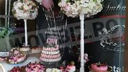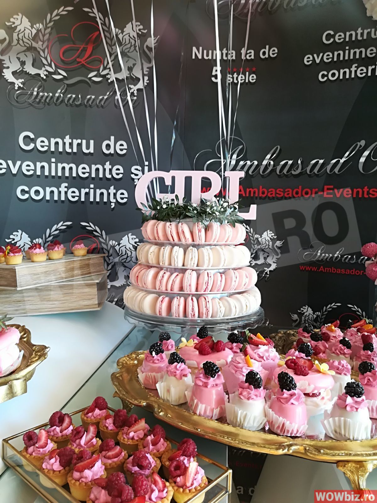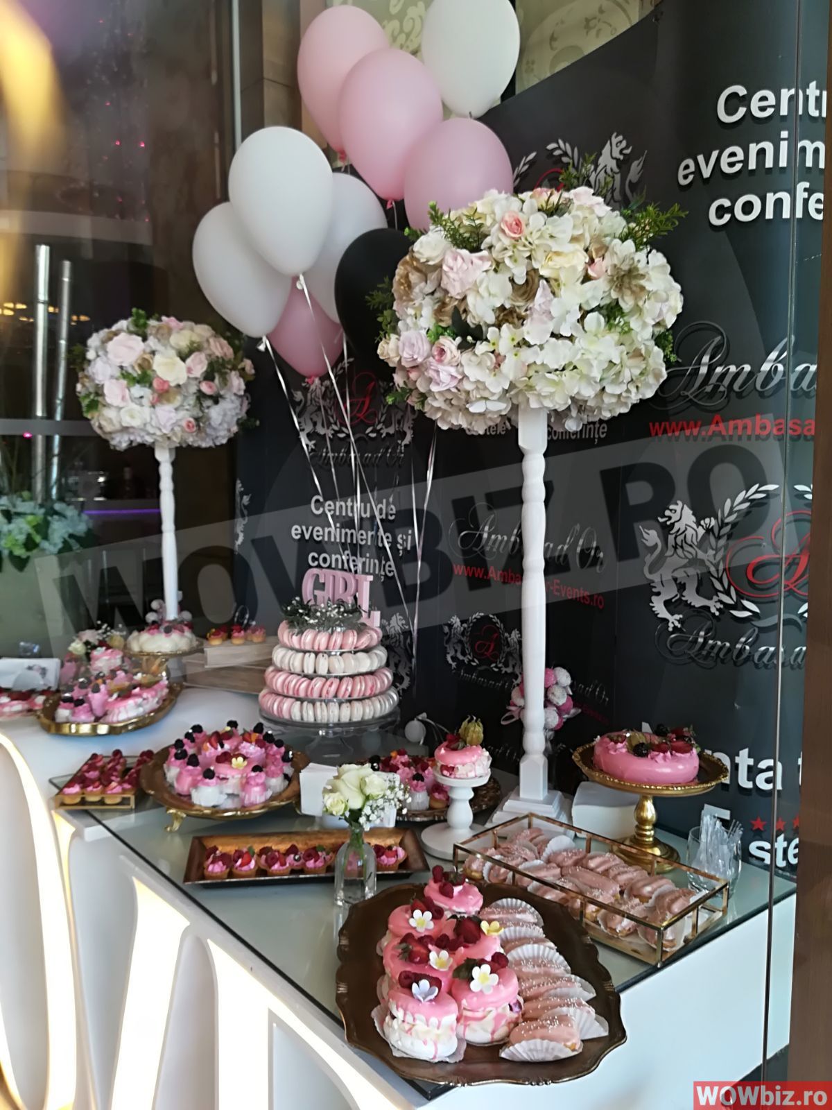 Ballroom-ul in care are loc petrecerea a fost amenajat special in culorile Pink&Black, asa cum de altfel este si tema petrecerii! Baloanele sunt in tot localul, canday-bar-ul, plin de prajiturele in acelasi ton, arata spectaculos,iar barul, pe care scrie “Happy Birthday”, este si el unul la inaltime, si a luat deja ochii primilor invitati.