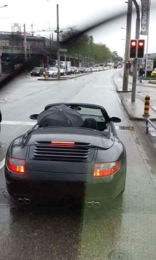 De ce spunem asta? Imaginea vorbeste de la sine. In Bucuresti ploua cu galeata si omul a decis sa iasa cu masina decapotabila la plimbare. Pentru a se proteja de stropii de ploaie nu a apelat la prelata masinii, ci si-a deschis umbrela in interior.